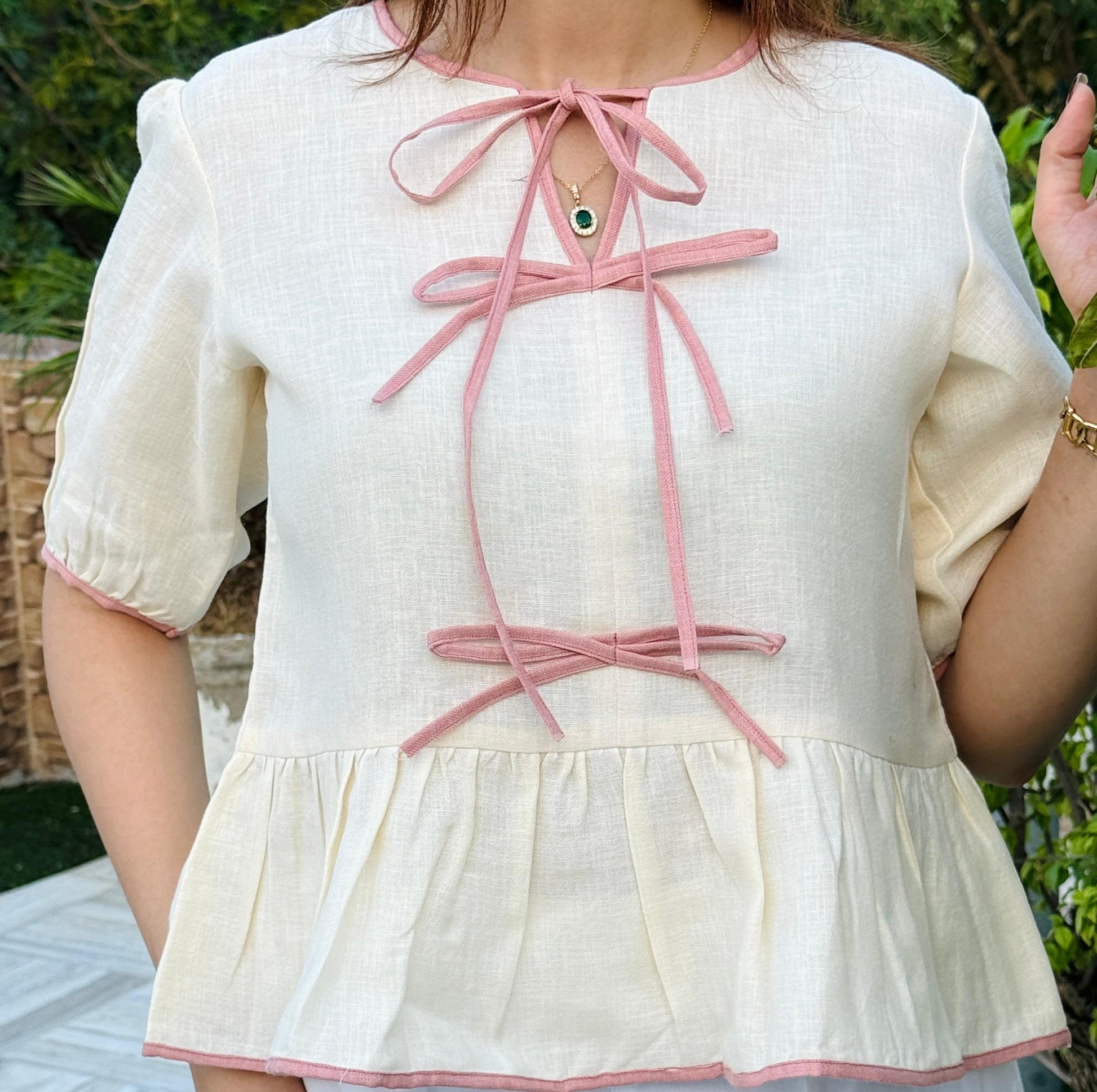 The Blush Bow Linen Peplum Top combines breathable linen with cotton lining for all-day comfort and a flattering, flowy fit. Playful blush pink bow detailing adds a touch of feminine charm, perfect for casual outings or elevated daywear.