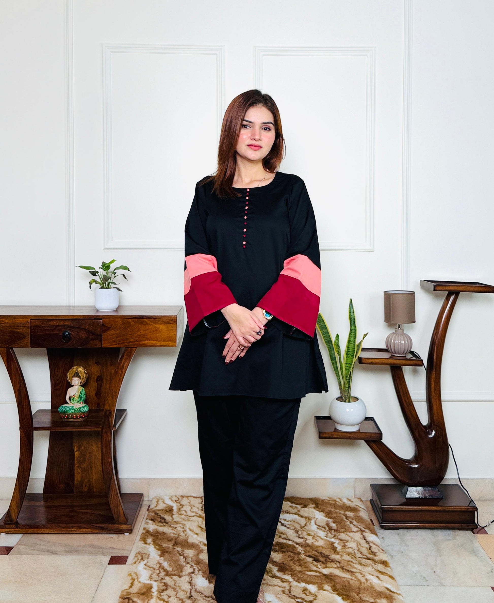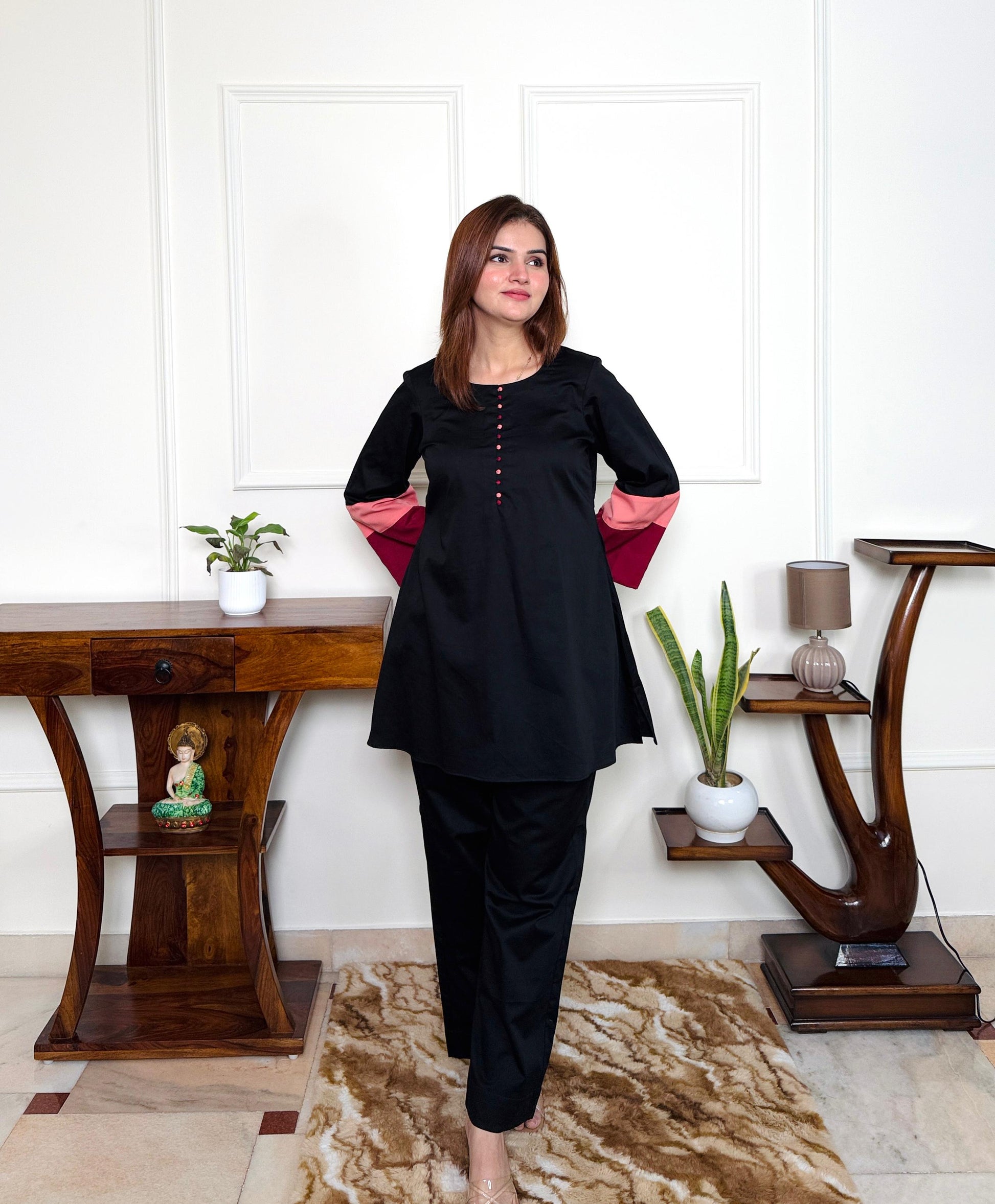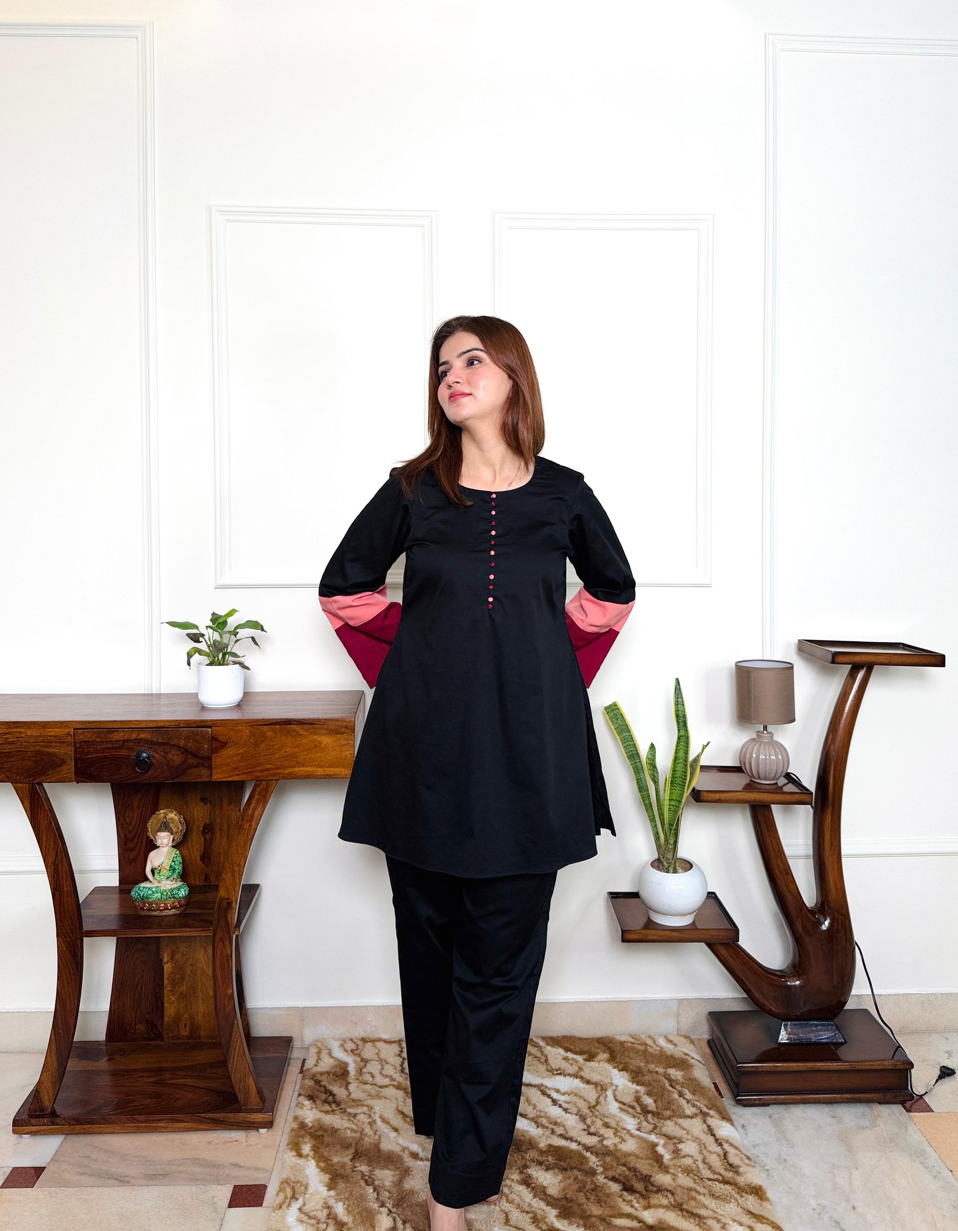 Bold meets minimal in our Crimson Edge A-Line Set. This black A-line kurta features elegant potli button detailing and striking color-blocked sleeves in berry and blush tones—offering a modern twist to traditional wear. Paired with sleek, straight-fit Giza cotton trousers, both pieces are lined with soft pre-washed cotton for unmatched comfort.