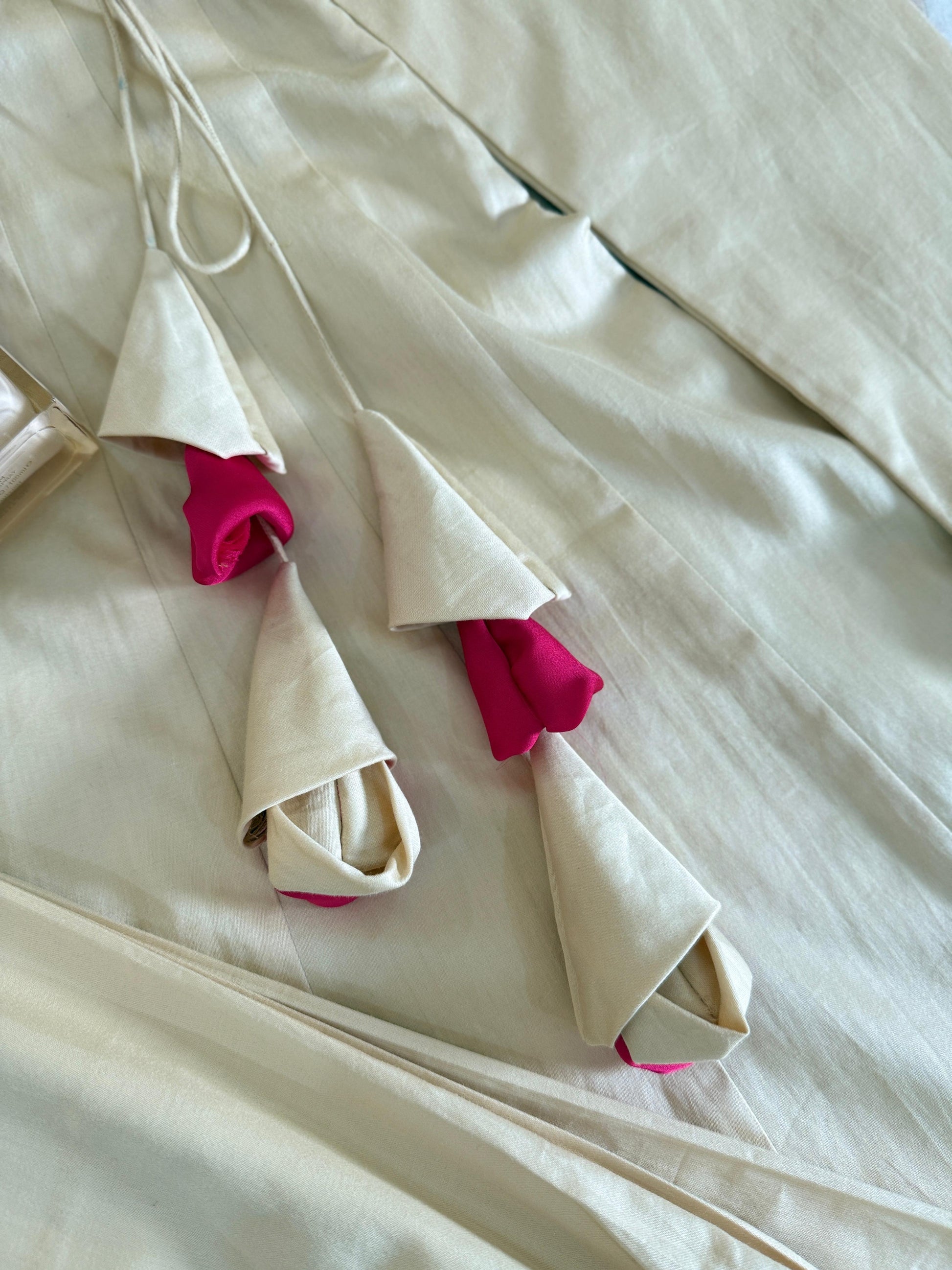 The voluminous silhouette adds a graceful flow, while the delicate tie-up detail enhances the charm of the outfit. Paired with matching cotton satin palazzo pants for extra volume and ease, and a contrasting vibrant pink dupatta that completes the ensemble with a pop of festive color.
