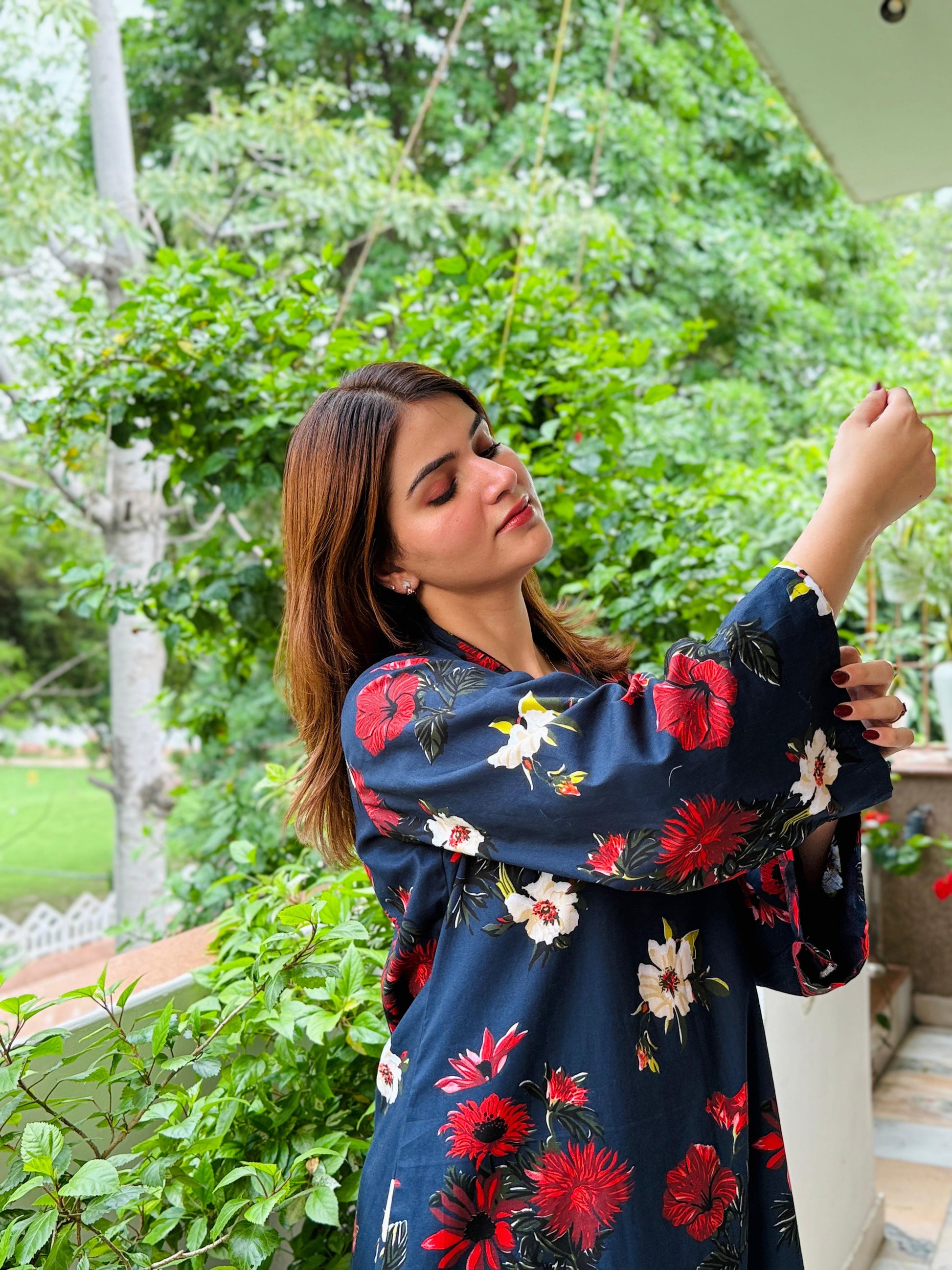 - Color: Deep navy base with red and white floral prints – vibrant yet classy