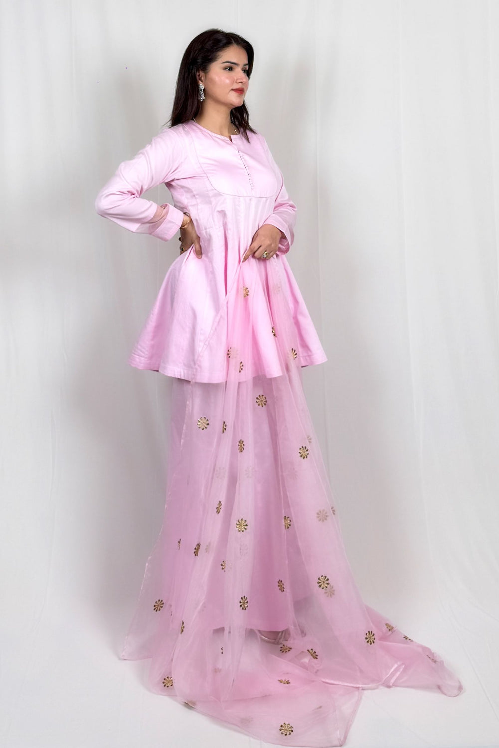 Delicate, dreamy, and effortlessly elegant, the  Roohani Pink Anarkali Set Ensemble is crafted for women who love soft festive hues with timeless silhouettes. Made in luxurious cotton satin fabric with pure cotton lining, this outfit offers unmatched comfort while maintaining a rich, graceful fall. The short Anarkali-style kurta and kali garara create fluid movement, enhanced beautifully by a sheer organza dupatta adorned with sequins and fine thread work. Designed for festive gatherings, daytime celebrations, and intimate functions, this handcrafted pastel ensemble blends subtle sparkle with refined ethnic charm.