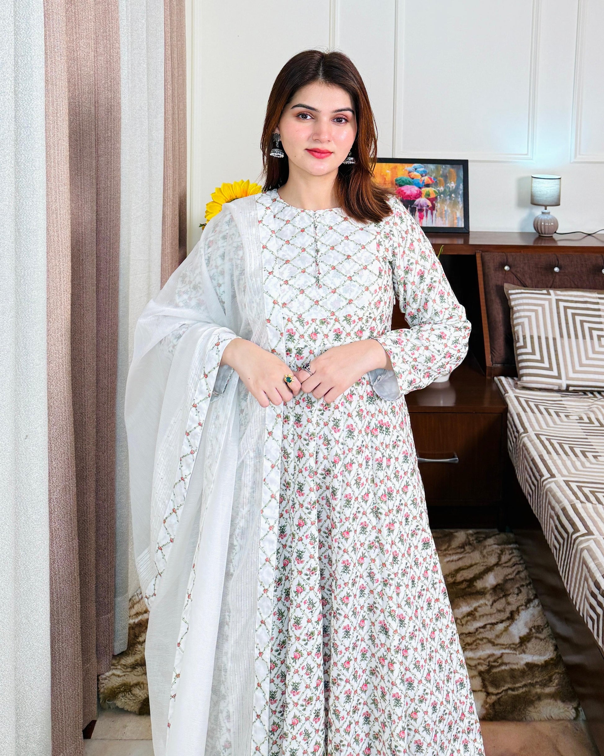 Meet Aanya — a timeless white Anarkali set crafted from 100% pure cotton for comfort and breathability. The soft floral print and intricate geometric detailing on the yoke and pants blend traditional artistry with modern minimalism. A sheer white dupatta with an embroidered sequence border adds a touch of shimmer. Thoughtfully lined for coverage, this elegant outfit is perfect for festive or casual occasions.