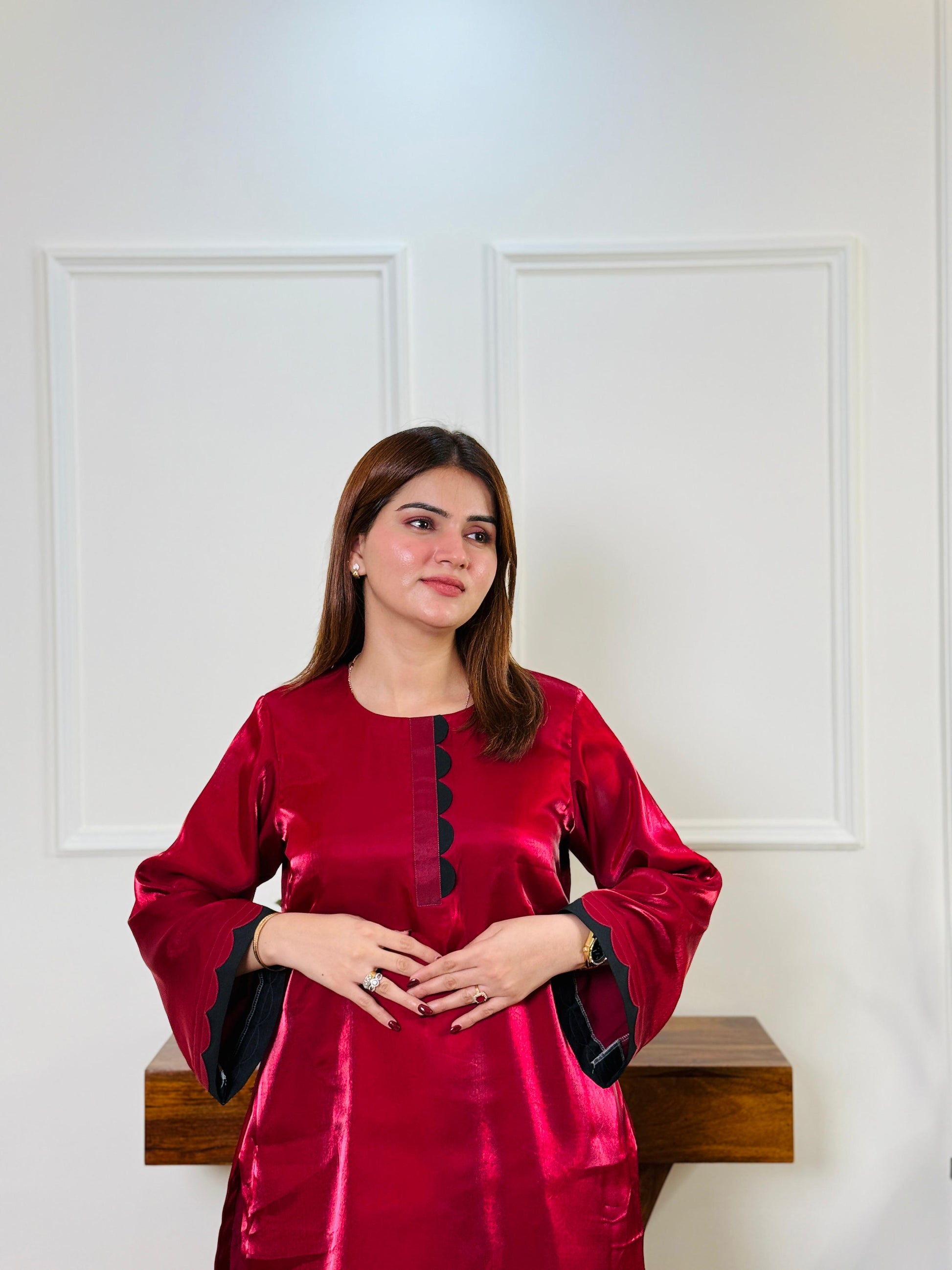 Richa D. Purchased this outfit for rakhi, this outfit is so different I haven’t wore anything of this kind fabric kuch alag hi hai, it is so shiny and shimmery perfect for festive wear, fit and look of this outfit is giving pakistani outfit vibe.