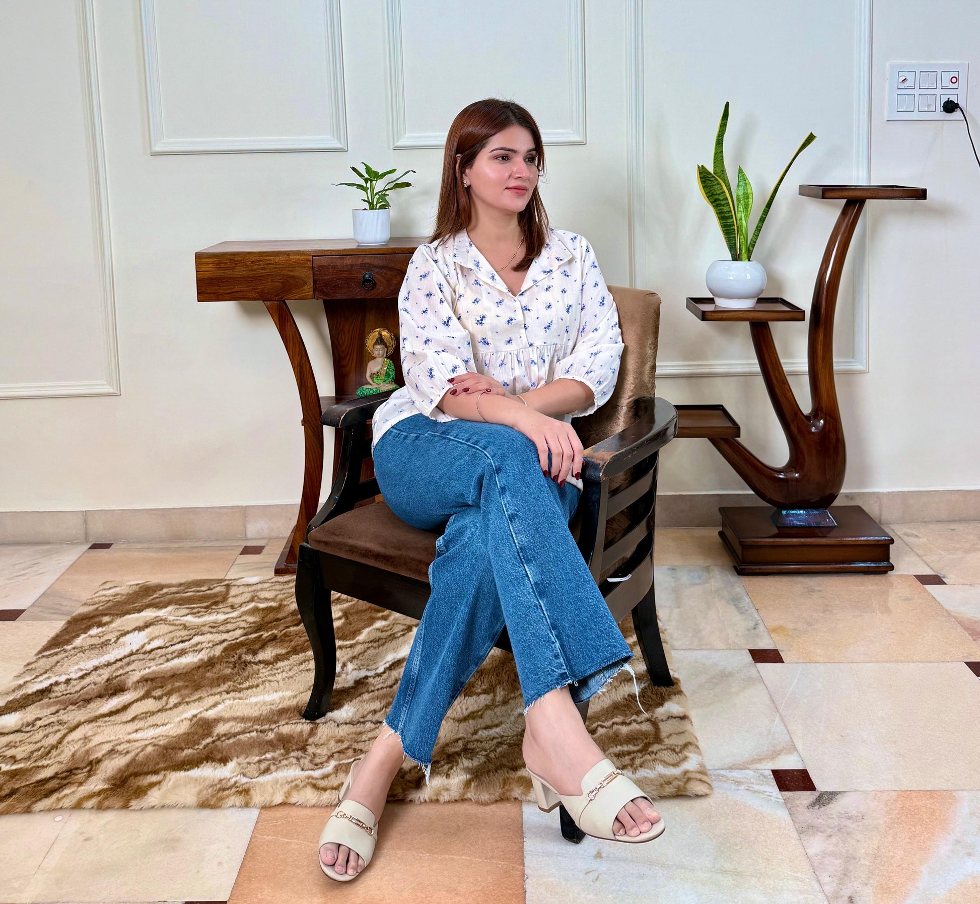 Soft, airy, and effortlessly charming — this pure cotton tunic features delicate blue florals on an off-white base, perfect for summer days.